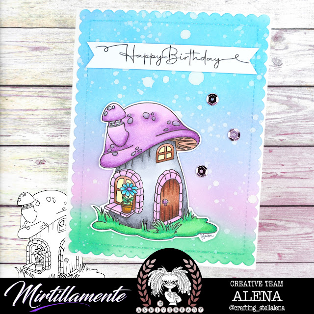 For this I used the digital stamp "Fairy Tale: Mushroom House No. 3" from the new release, which you can find in the Mirtillamente Craft Shop. I colored the house with Copics and Spectrum Noir Illustrators. For the background I used different Distress Oxides. The sentiment is from the WordZ collection "Happy Birthday No. 3" which is also available in the shop.